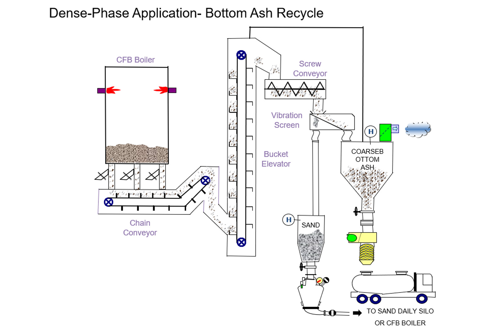- Sistem penanganan abu dasar terdiri dari peralatan transfer mekanis seri karena karakteristik partikel abu dasar yang kasar & besar. Ini dapat terdiri dari konveyor rantai, elevator ember, dan konveyor sekrup tergantung pada tata letak pabrik dan kebutuhan pelanggan. Beberapa pembangkit listrik CFB diharuskan memisahkan pasir dari abu dasar agar dapat digunakan kembali untuk proses pembakaran.